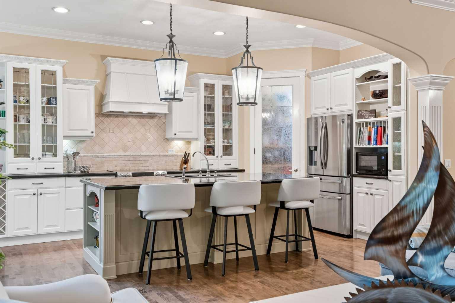 From the moment you step inside, the home greets you with soaring ceilings, rich millwork, and warm hardwood that together create a sense of refined luxury. The living room, anchored by a beautiful fireplace, looks out through expansive windows to the forest beyond—a daily reminder that here, peace and privacy are yours. The gourmet kitchen is as inviting as it is functional, with a large island, granite counters, and a bright breakfast nook that catches the morning sun. Just beyond, a formal dining space welcomes gatherings, while a charming main floor office framed by bay windows offers an inspiring place to work. The primary suite completes the main level, its serene outlook onto the trees paired with a luxurious ensuite and custom walk-in closet, making it the perfect retreat.